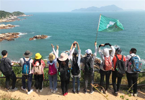 平整的小路没有分岔,沿着山腰在树林之间穿行。最后来到一山顶开阔的平地时,就看见东冲海滩就在山下了。下山走过片片的鱼塘来到海边,穿越正式结束。